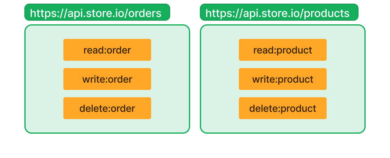 La figure ci-dessus montre que la permission read:item dans la ressource https://api-1.store.io est différente de la permission read:item dans la ressource https://api-2.store.io.