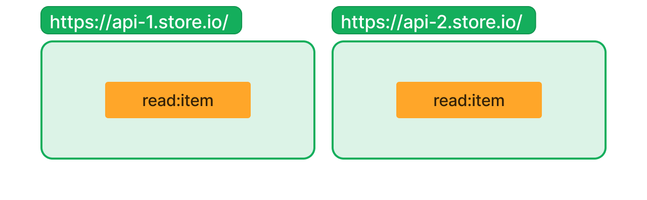 A figura acima mostra que a permissão read:item no recurso https://api-1.store.io é diferente da permissão read:item no recurso https://api-2.store.io.