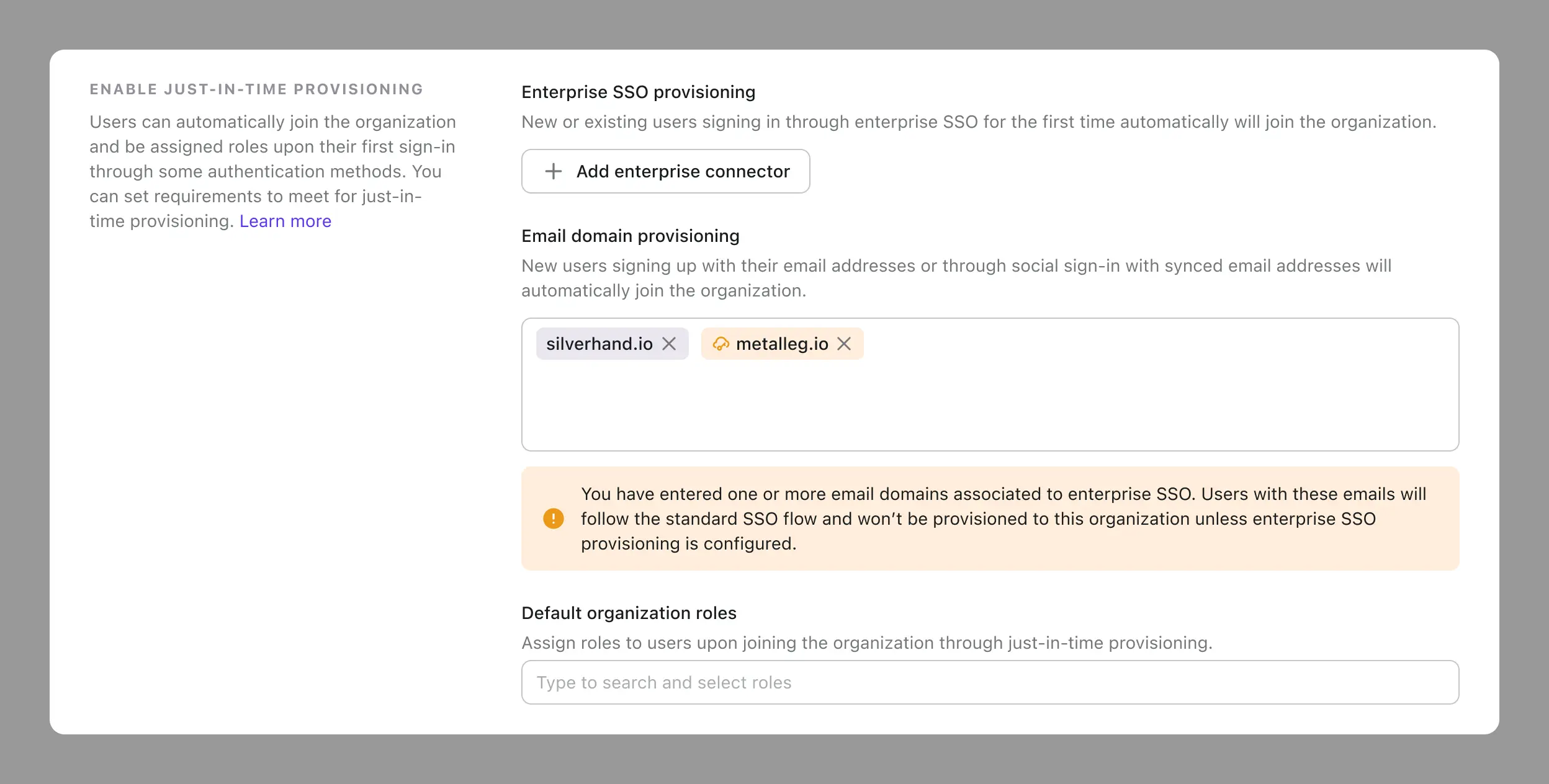为了解决这个问题,我们将在配置时显示警告信息。确保你通过选择正确的 SSO 连接器来启用企业 SSO 供应,而不是依赖电子邮件域供应。